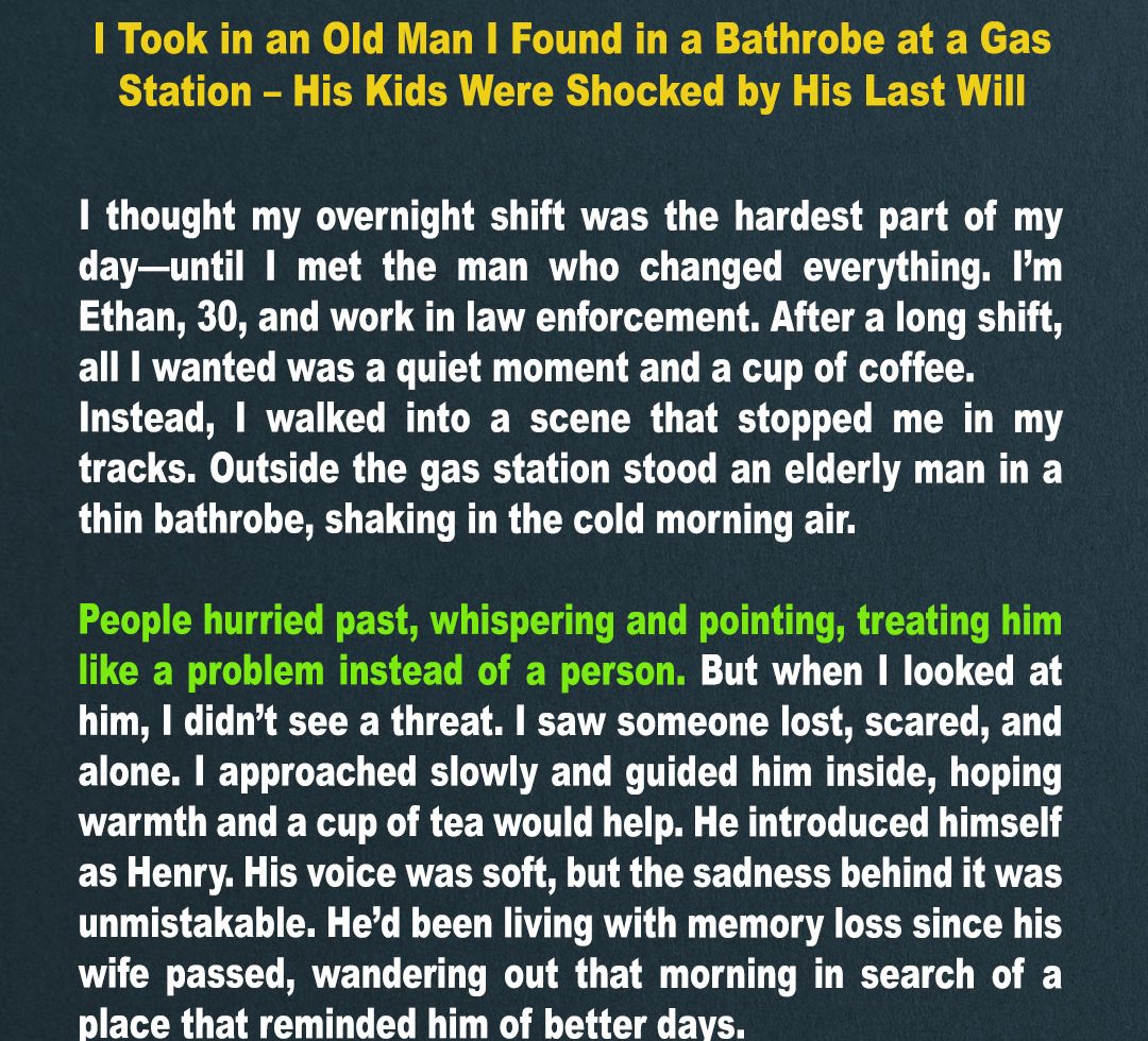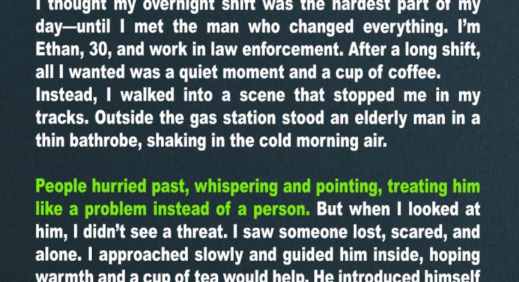I’m a cop, and I’ve seen plenty of hard things on the job. But nothing prepared me for finding an elderly man shivering at a gas station in just a bathrobe while crowds ignored him. I took him home that day, and months later, his children discovered exactly what their cruelty had cost them.