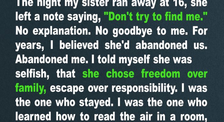 We didn’t see her again for a long time. Postcards came sometimes. A phone call once a year if we were lucky. Mom defended her weakly. Dad never spoke her name. And I grew up with a hole where my sister should have been, telling myself I didn’t need her.