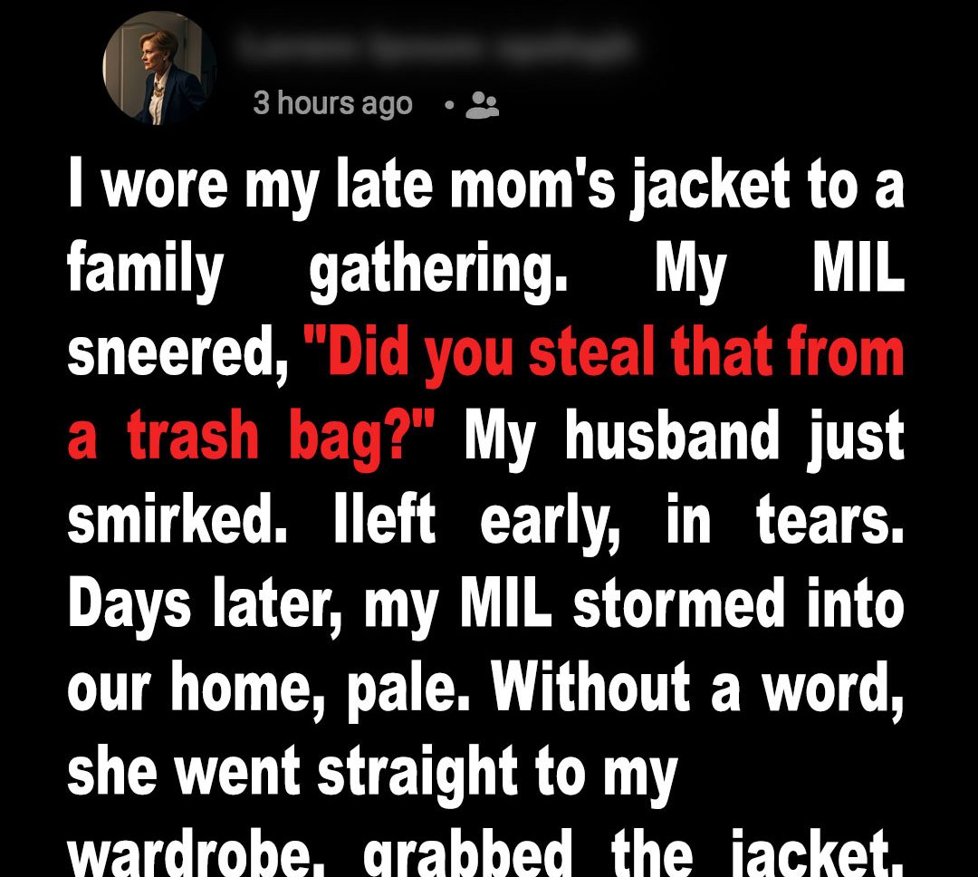 He told me that at the gathering, when he saw me leave in tears, something in him finally snapped. Not loudly. Not dramatically. Quietly. He mentioned to his mother, casually, that my mom had actually been wealthy but chose to live modestly. That the jacket I wore was far more valuable than it looked.
