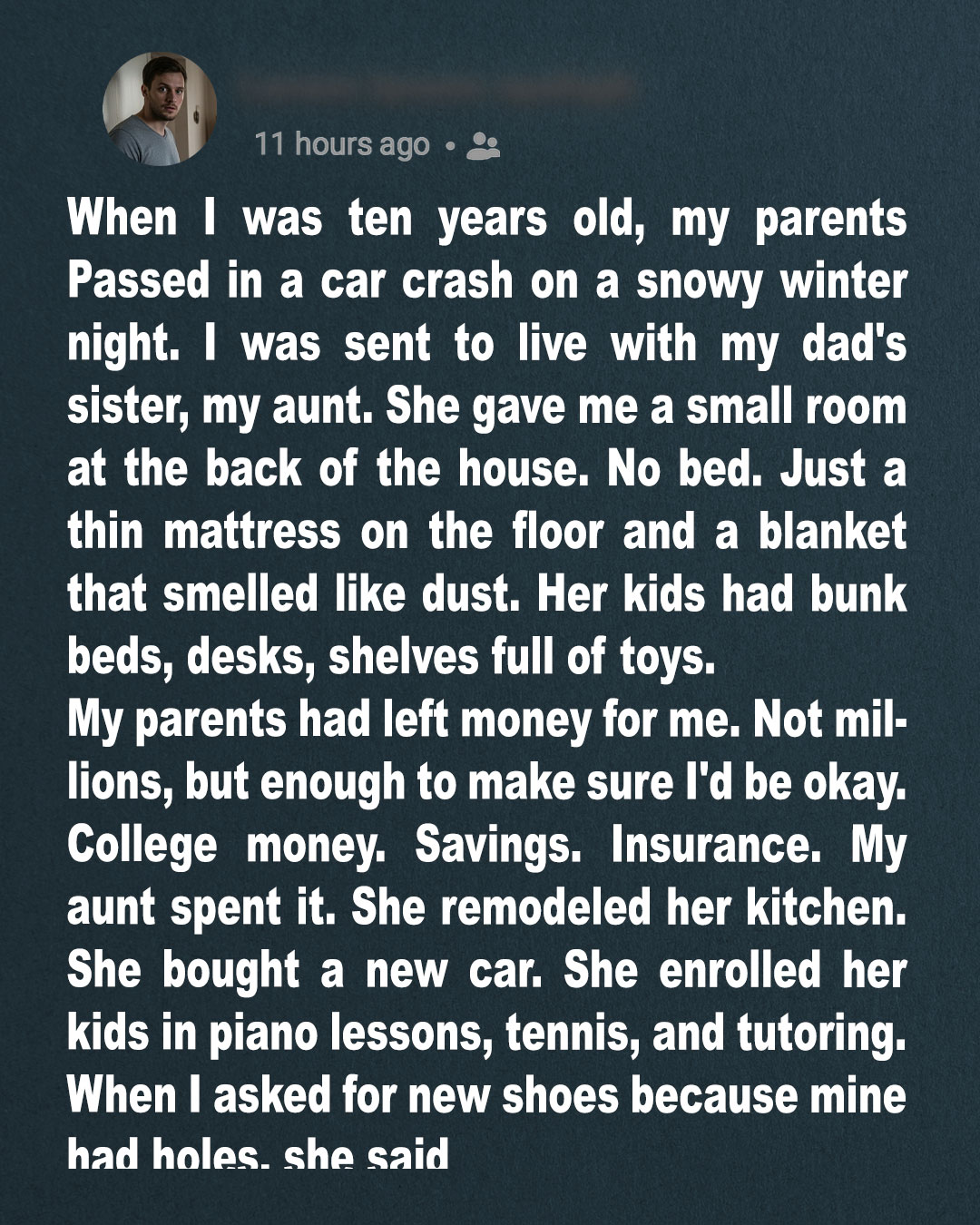 When my parents died, my aunt said she was “saving” me. I slept on a mattress on the floor and grew up believing I owed her my life—until, years later, she came back to collect.