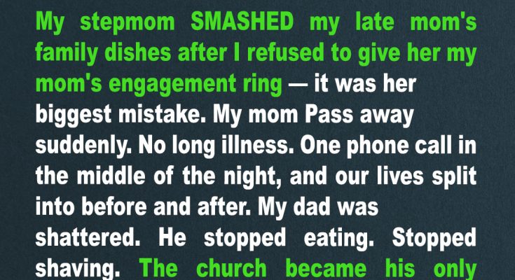 My stepmom demanded my late mom’s engagement ring. When I refused, she grabbed my mom’s heirloom dishes and started smashing them against the wall. She thought she had all the power. But she didn’t realize I was holding something that would destroy her faster than any broken plate ever could.