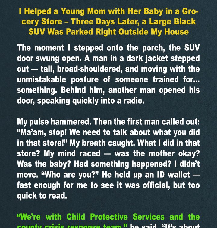 I Helped a Young Mom with Her Baby in a Grocery Store – Three Days Later, a Large Black SUV Was Parked Right Outside My House