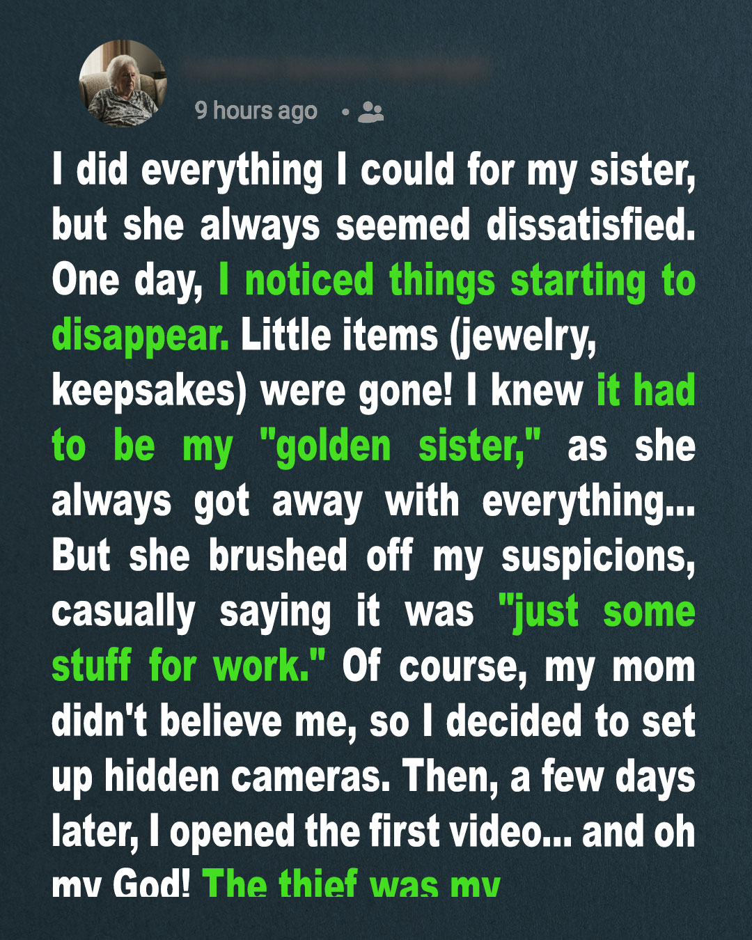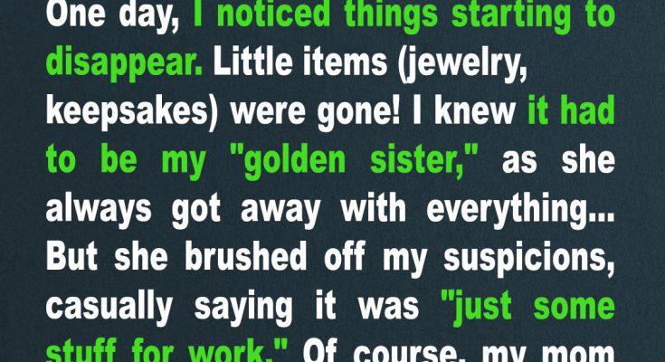 Taking care of Mom was hard enough without the tension with my sister. Accusations flew when precious things started disappearing. I thought I knew who was to blame, but the truth shattered my world. Betrayal came from where I least expected, leaving me questioning everything—and everyone—I trusted.