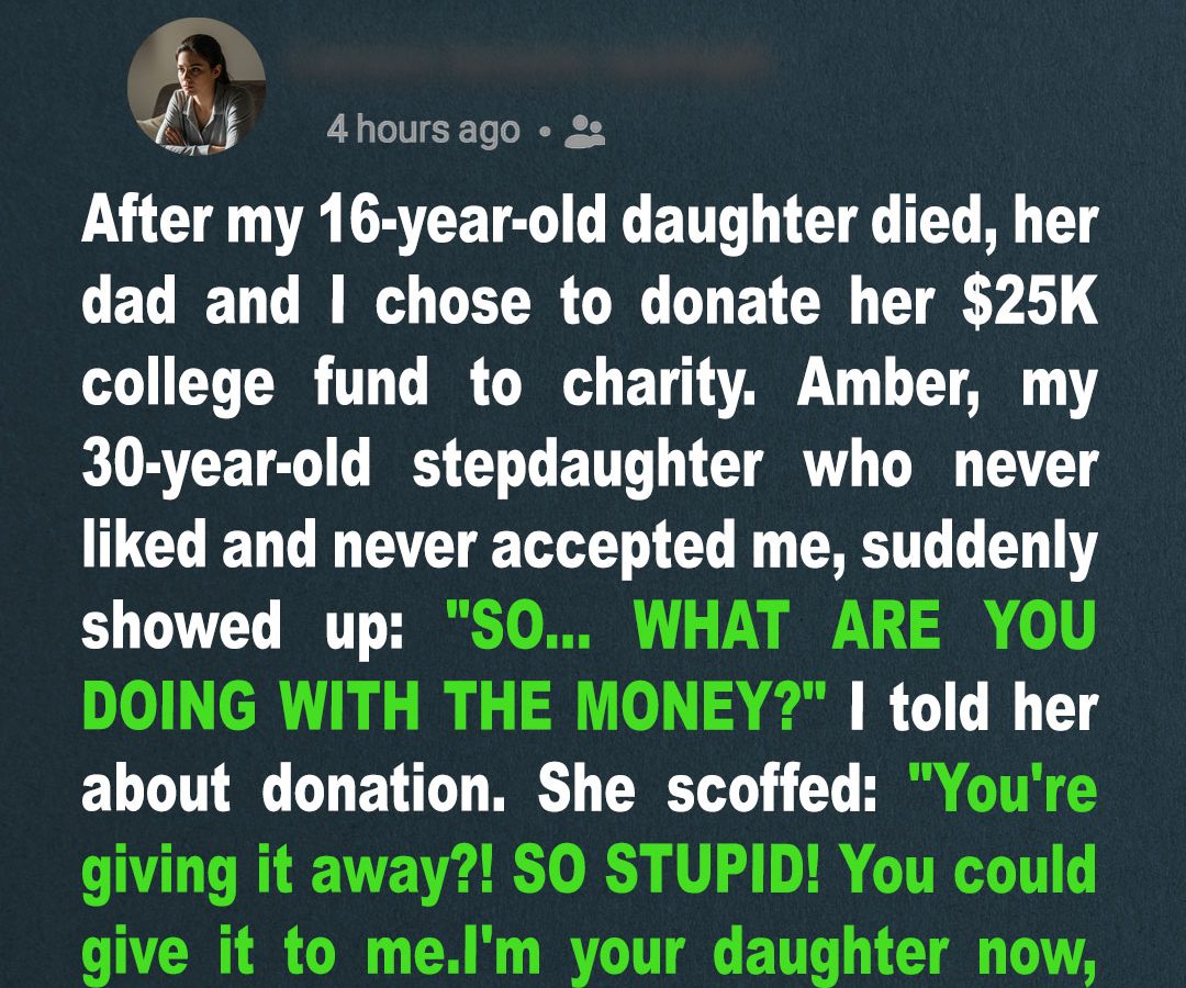 Then everything changed when my stepdaughter Amber appeared at my door. She had always treated me like an outsider, so her sudden show of sympathy felt forced. After a few awkward words about Emma’s death, she jumped straight to the real reason for her visit — asking what we planned to do with the college fund.