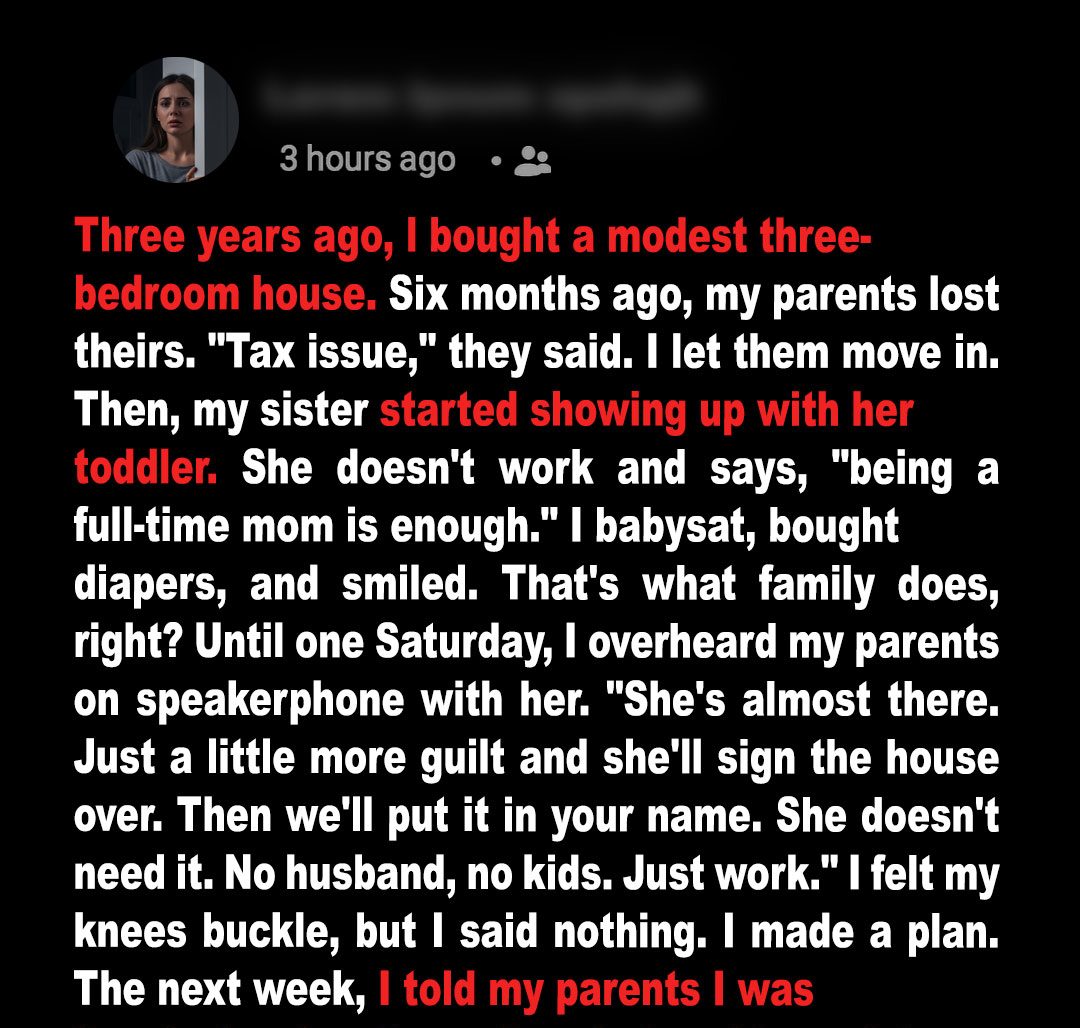 And then I overheard them. It was a Saturday while everyone was supposedly out — and I was grabbing a glass of water when I heard my mom on speakerphone. She and my dad were talking to Claire, laughing about how close they were to getting me to sign the house over. They said all I needed was a little guilt, then they’d put the property in Claire’s name and move in with “the baby.” My heart froze. Their plan was to use guilt to take my home — the one I worked so hard for — so they could build a future while I was left with nothing.