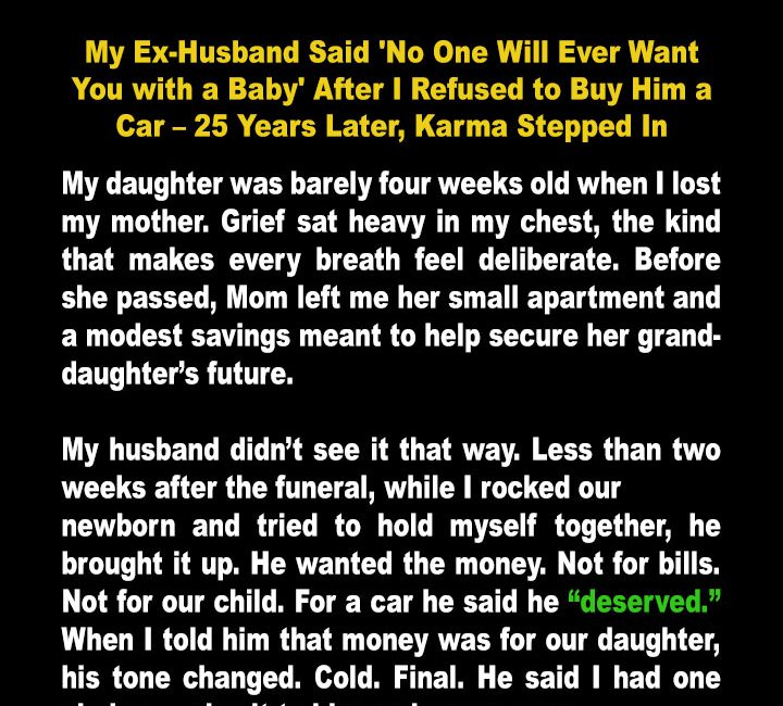 The week I became a mother, I also became an orphan — and my husband decided my daughter’s inheritance should buy him a new car. When I chose my baby over his ultimatum, he vanished. He lived the high life while I struggled, but 25 years later, karma caught up with him.