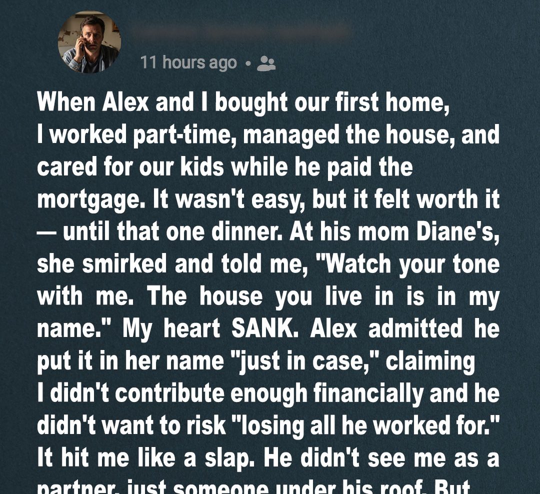Over the next decade, Alex worked tirelessly to pay off the mortgage — but the house was never legally theirs. Then, just two weeks after the mortgage was finally paid off, Diane called with a shocking update: she was giving the house to Alex’s sister, because it was technically hers. Alex was furious, but legally, there was nothing he could do.
