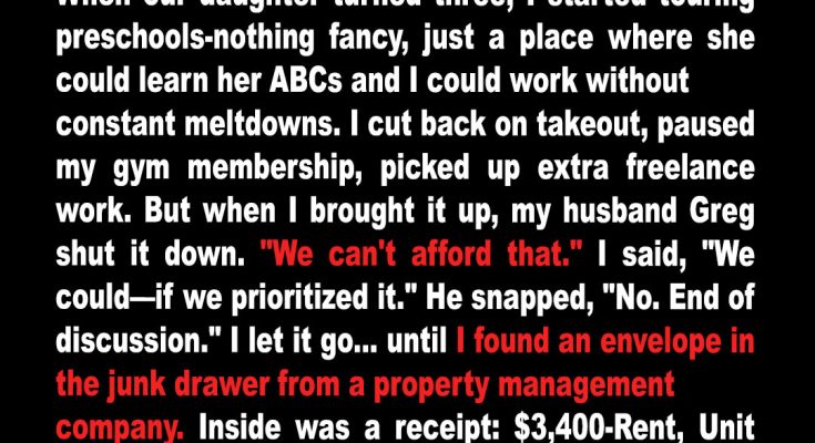Then one day while spring-cleaning, I found a cream-colored envelope in the junk drawer — addressed to Greg, but crossed out and with our home address scribbled over it. Inside was a receipt: “Payment received: $3,400 – Rent – Unit 504B, The Grand Apartments.” My heart sank.