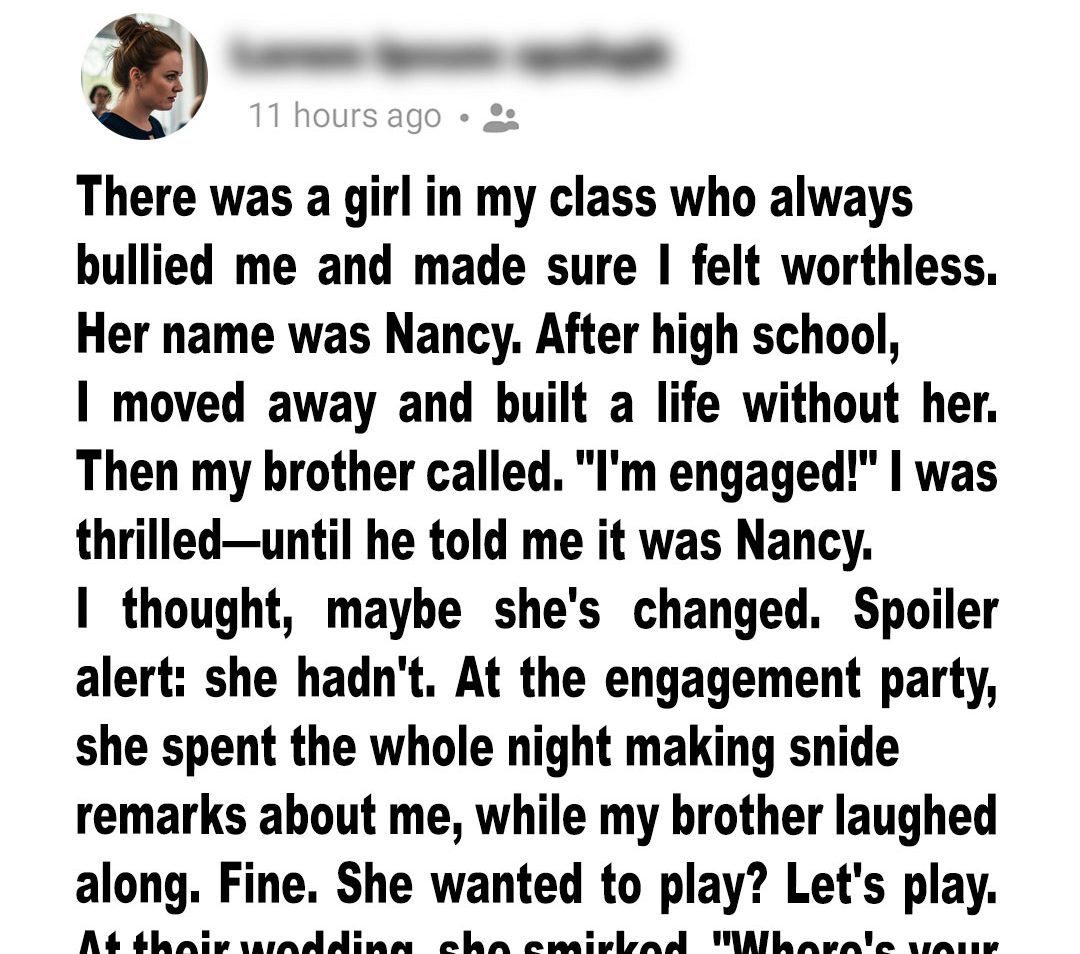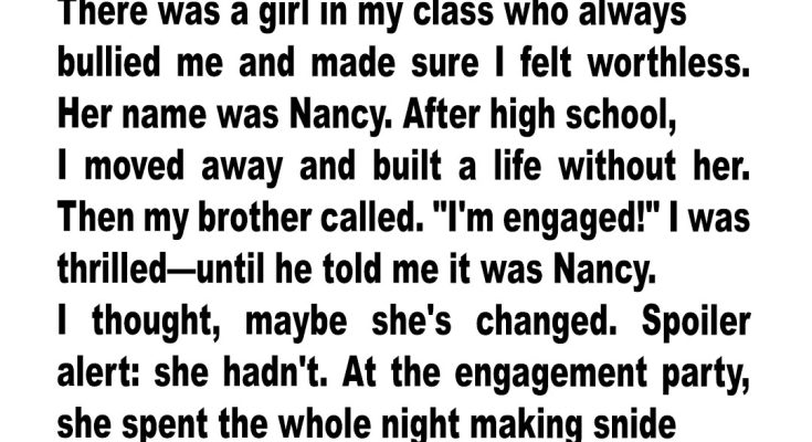 When my brother told me he was engaged to Nancy, I forced a smile and said “That’s amazing!” — even though my stomach flipped. Nancy wasn’t just someone I knew in school … she was the girl who made my childhood miserable.