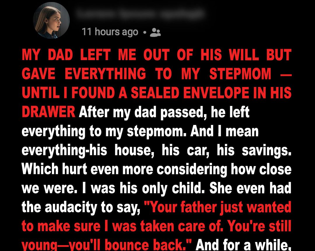 They say grief hits in waves. But nothing could’ve prepared me for the shock of being cut out of my father’s will entirely — until a hidden envelope in his workshop revealed the truth he left behind.