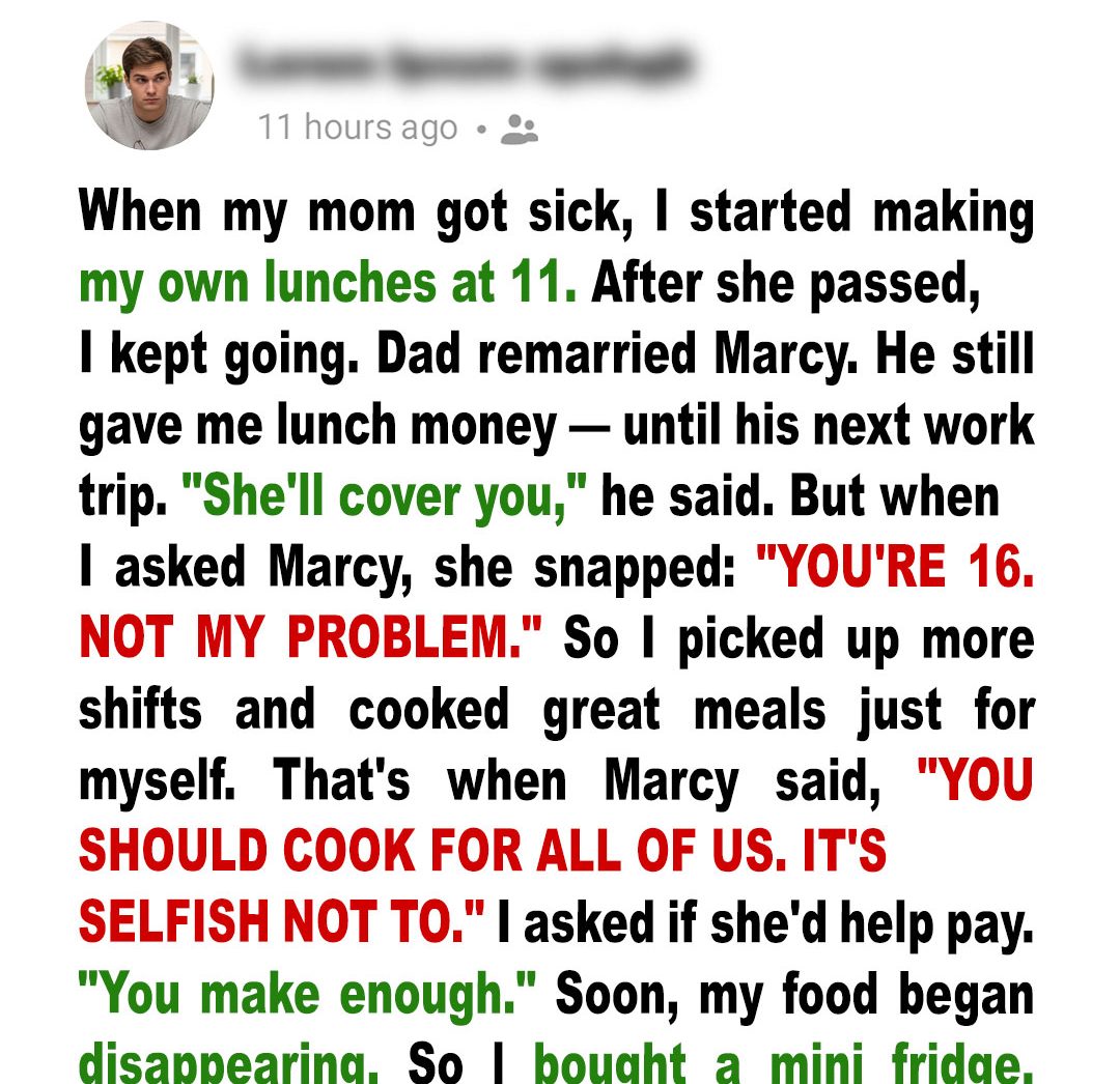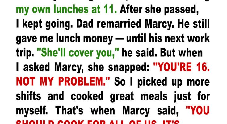 When my dad left town for a two‑week work trip, he told me the money for lunches would be on the counter — that my stepmom, Marcy, would take care of it. Except the first morning after he left, I found her scrolling her phone while her kids devoured sugary cereal. When I asked about the lunch money, she sneered, “You’re 16. Not my problem.” That’s when everything changed.
