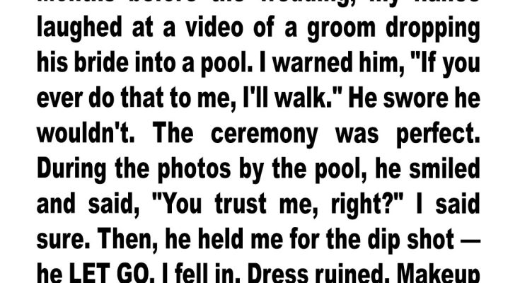 The reception buzzed with laughter, guests dancing and toasting under twinkling lights by the pool. We were euphoric, wrapped up in our joy — until everything changed in an instant. My husband, smiling and holding me close, suddenly shoved me. Before I knew it, I was underwater, gasping as cold water shocked my system and soaked my gown. The music cut out and the party froze in stunned silence.