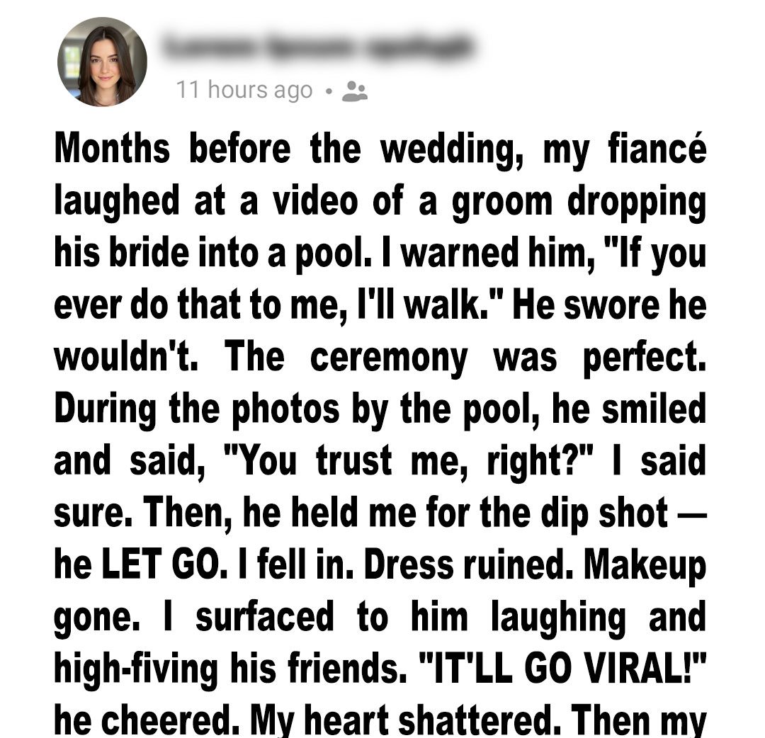 Then he shared something even more shocking: my husband had seen an old photo album from my parents’ wedding. In that picture, my dad laughed while my mom stood crying, drenched from the pool. My husband smirked, told my dad he planned to do the same thing to me, calling it “tradition.”