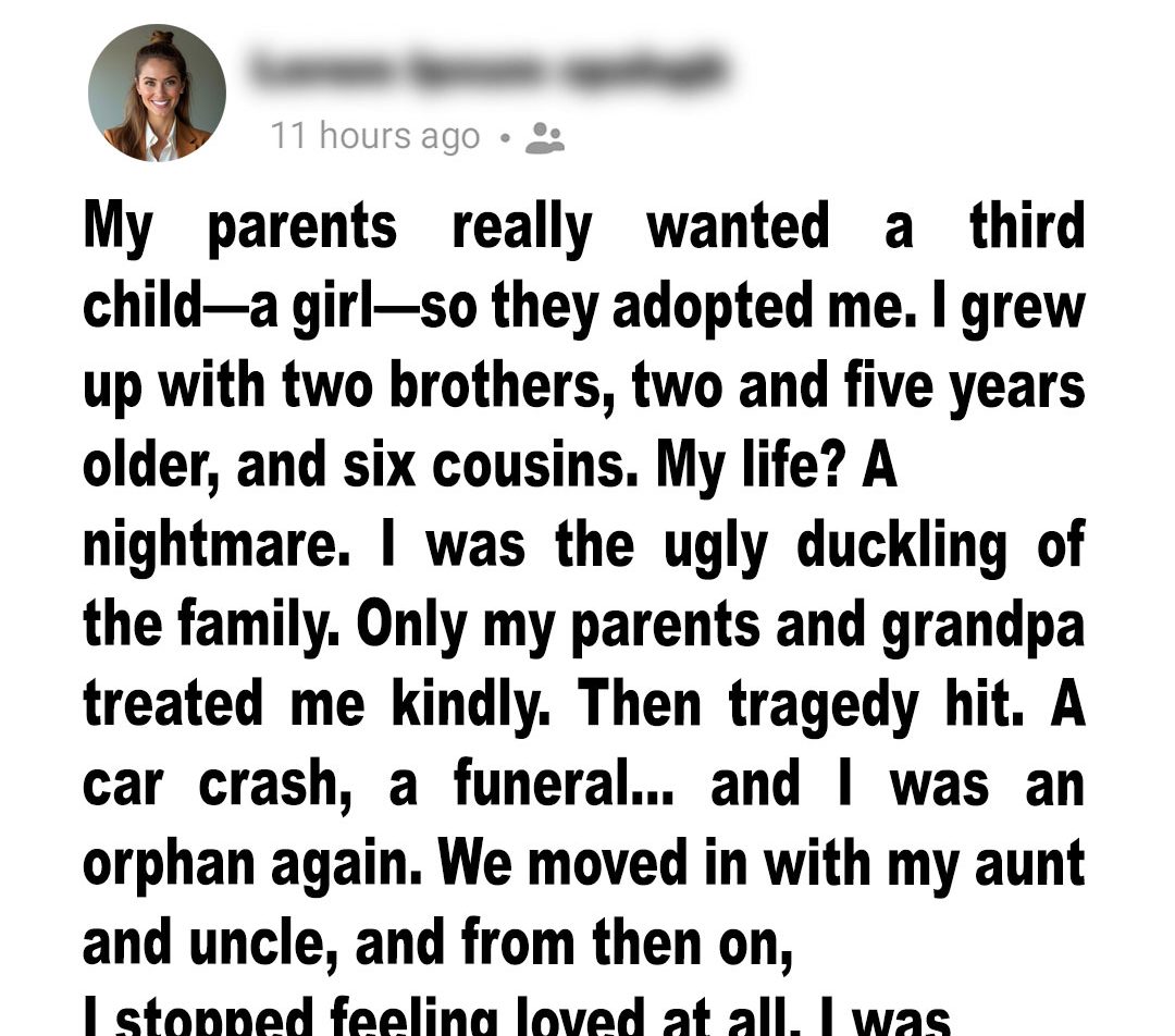 Then tragedy struck. A car accident claimed my parents’ lives, and suddenly I was alone again. I moved in with my aunt and uncle, people I barely knew. They acted polite, but it was clear I wasn’t truly part of their family. While my brothers and cousins sat at the center of attention — laughing and sharing dinners — I hovered on the edges, invisible.