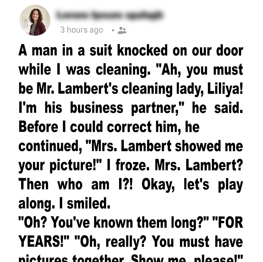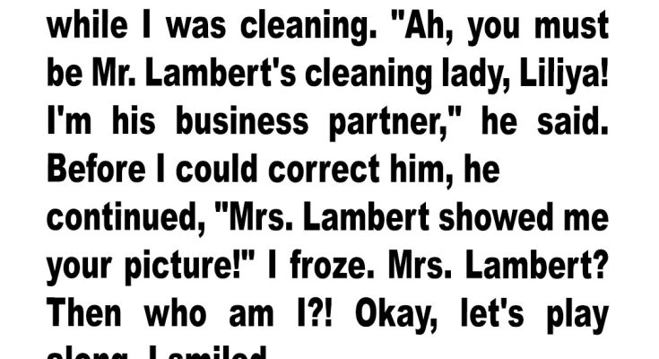 He flashed a polished smile and said, “Hi! I’m looking for Mr. Lambert. You must be the cleaning lady — Liliya, right?” He spoke with confidence, like he already knew me.