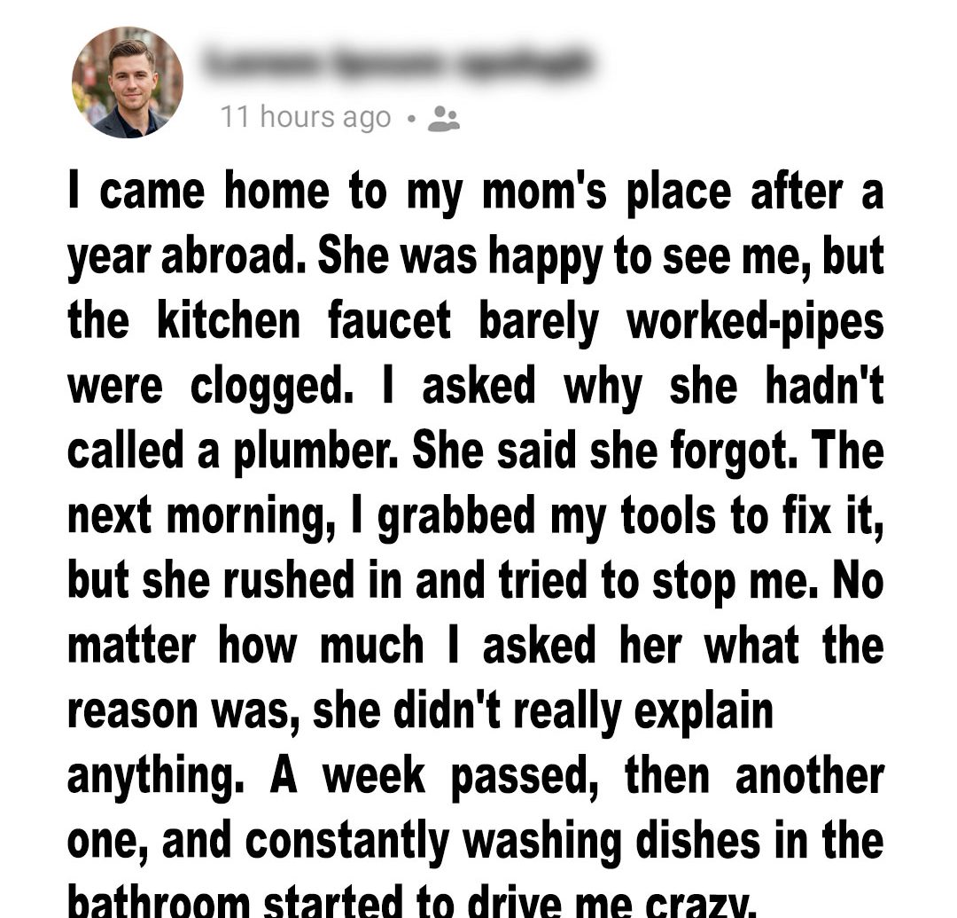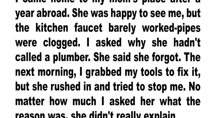 After a year abroad, I came home expecting hugs and Mom’s delicious food. What I didn’t expect was a clogged sink in our kitchen. I offered to fix it, but Mom panicked and stopped me. When I finally opened those pipes while she was out, I uncovered a chilling truth she’d been hiding for years.