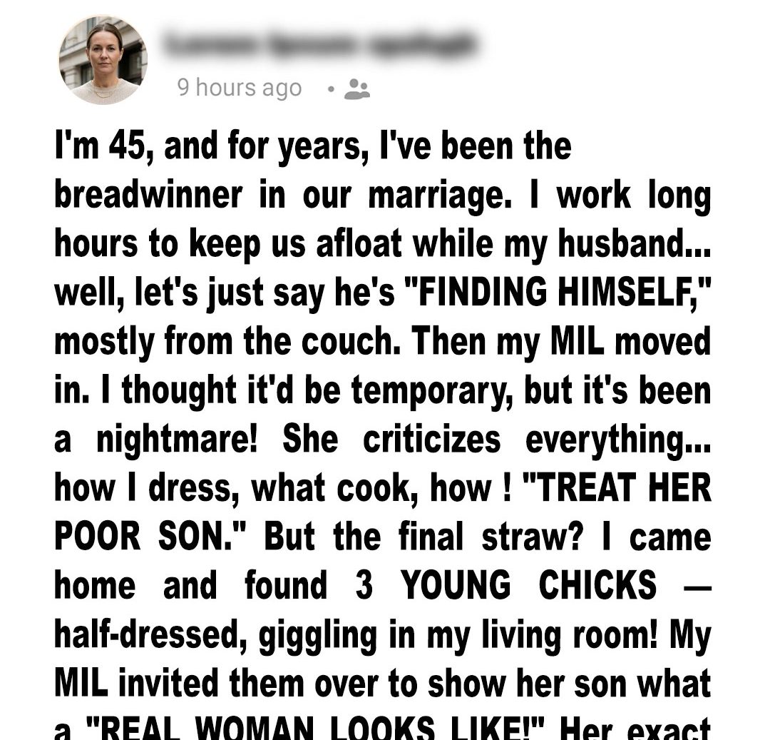 My mother-in-law moved in “to help,” but when I came home to find three young, attractive women living in my house — folding laundry, flirting openly, and even cutting my husband’s hair — I realized I wasn’t just tired. I was being replaced. At forty, my life had become pure chaos. Three kids, a demanding job, and a husband who seemed checked out. I felt like the star of a survival show, except the jungle was my kitchen and the predators were endless chores.