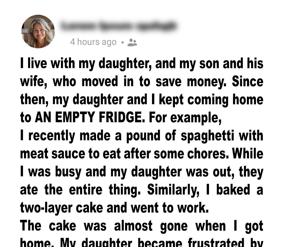I never thought I’d have to fight for food in my own home. But for weeks, my daughter Ruby and I were repeatedly left hungry while my son Brian and his wife Emily helped themselves to everything I cooked. It got so bad that I had no choice but to give them a serious reality check. This is the story of how generosity turned into resentment and how I finally stood up for us.