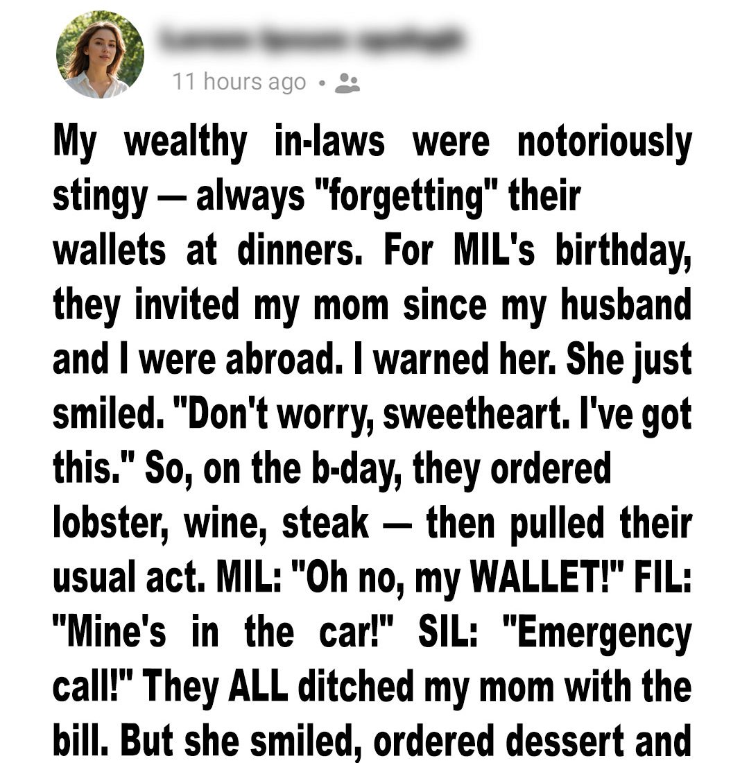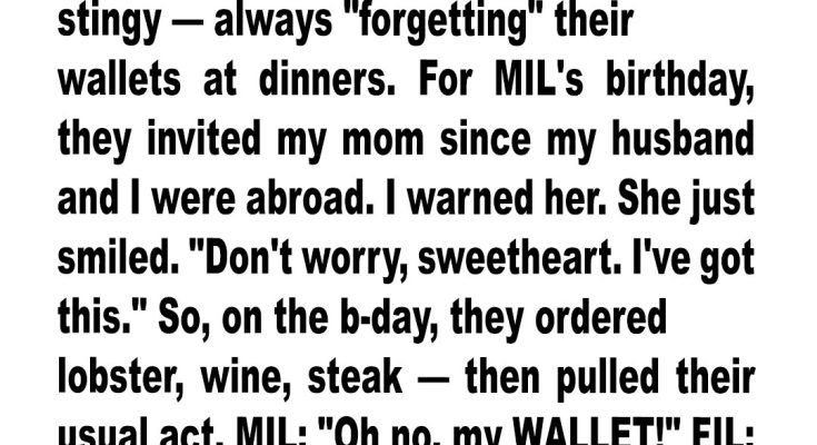 For years, my wealthy in-laws had pulled the same cheap trick: “forgetting” their wallets at dinner and slipping away, leaving others stuck with the bill. When they invited my mom to a fancy Italian restaurant for my mother-in-law’s 60th birthday, they thought she’d be an easy target. They had no idea my mom was ready — and this time, their scam backfired spectacularly.