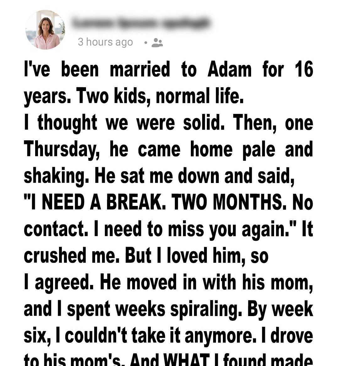 When my husband Adam asked for a two-month break after 16 years of marriage, I was convinced another woman was involved. The truth I eventually uncovered left me sobbing on the kitchen floor and completely changed everything I thought I knew about love. I never imagined I’d share this story, but after everything that happened, I need to get it off my chest.