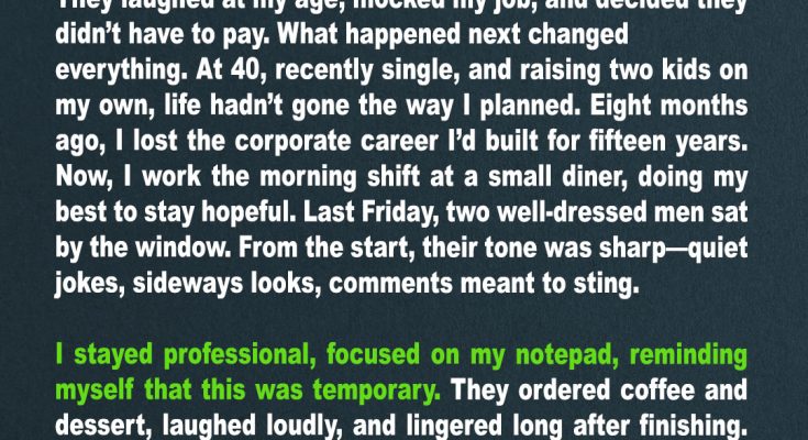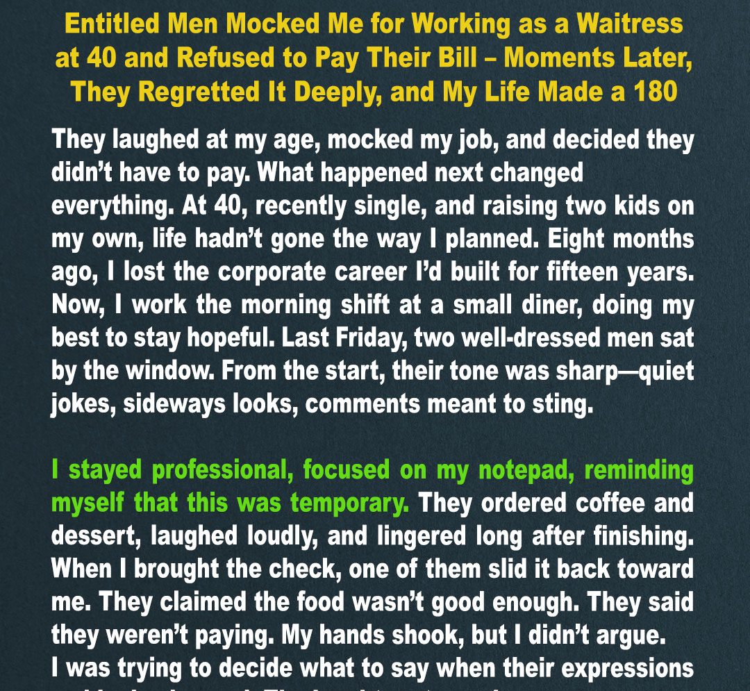 Entitled Men Mocked Me for Working as a Waitress at 40 and Refused to Pay Their Bill – Moments Later, They Regretted It Deeply, and My Life Made a 180 Degree Turn