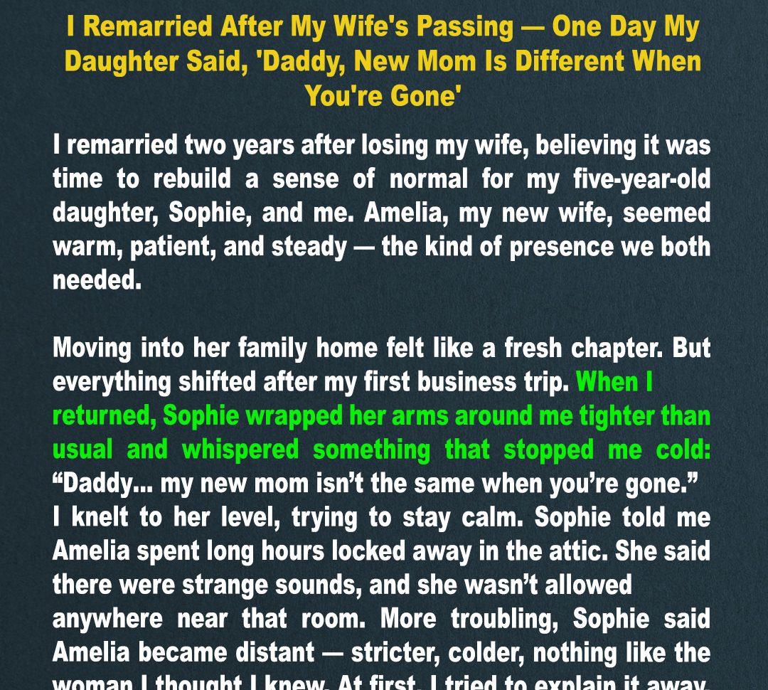 Two years after my wife’s passing, I remarried, hoping to rebuild my family. But when my 5-year-old daughter whispered, “Daddy, new mom is different when you’re gone,” I was stunned. Strange noises from a locked attic, strict rules, and Sophie’s fear spark a chilling mystery I can’t ignore.