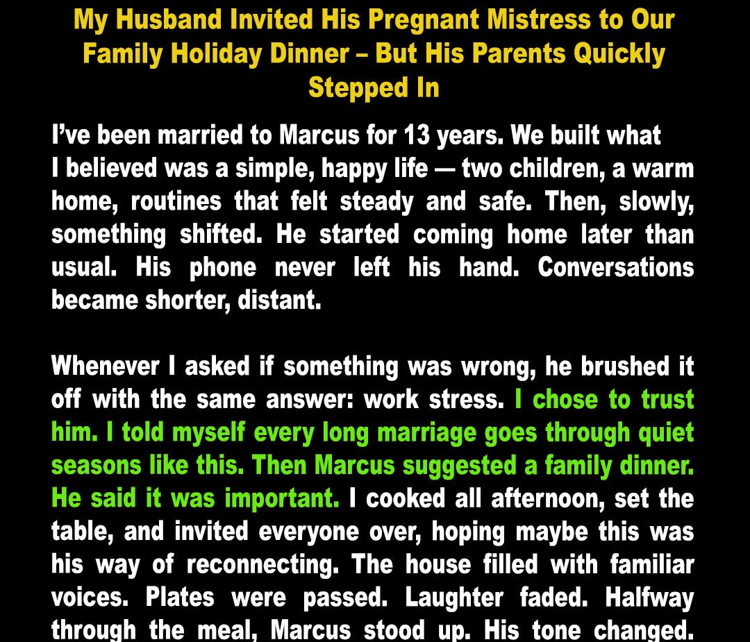 My Husband Invited His Pregnant Mistress to Our Family Holiday Dinner – But His Parents Quickly Stepped In