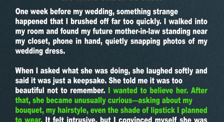 A week before her wedding, she caught her future MIL secretly photographing her dress. Odd, but harmless — or so she thought. On the big day, the church doors opened… and in walked her MIL in the same gown. But nothing could prepare anyone for what the groom did next.
