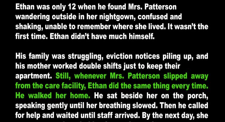 No more eviction nightmares; Mom quit one job, sobbing tears of relief into my hair that first night. “Ethan, you saved us,” she whispered, hugging me so tight I couldn’t breathe. But it wasn’t me. It was her—Mrs. Patterson—who’d wandered into our lives.