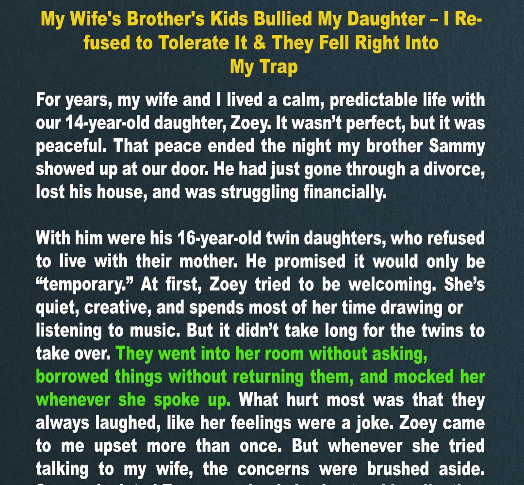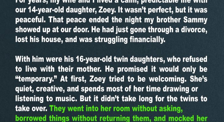 “David, please,” she said one evening, her eyes already filling with tears. “They’re family. I can’t let my brother and those girls end up in some awful motel or shelter. It’ll just be for a few weeks while Sammy gets back on his feet.”