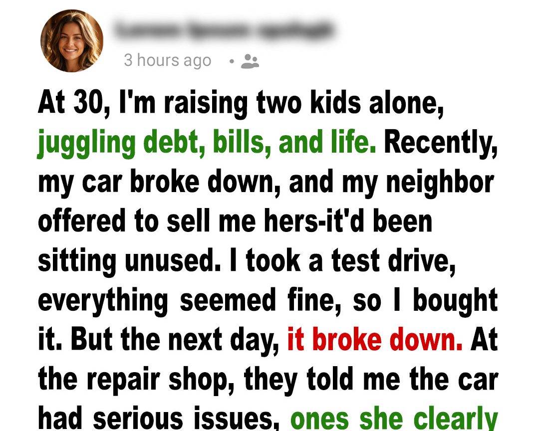You know that moment when life kicks you while you’re already down? My scheming neighbor thought she could pull a fast one on a broke single mom like me. She tricked me into buying her busted car and figured she’d pocket my hard-earned money. But the universe had other plans.